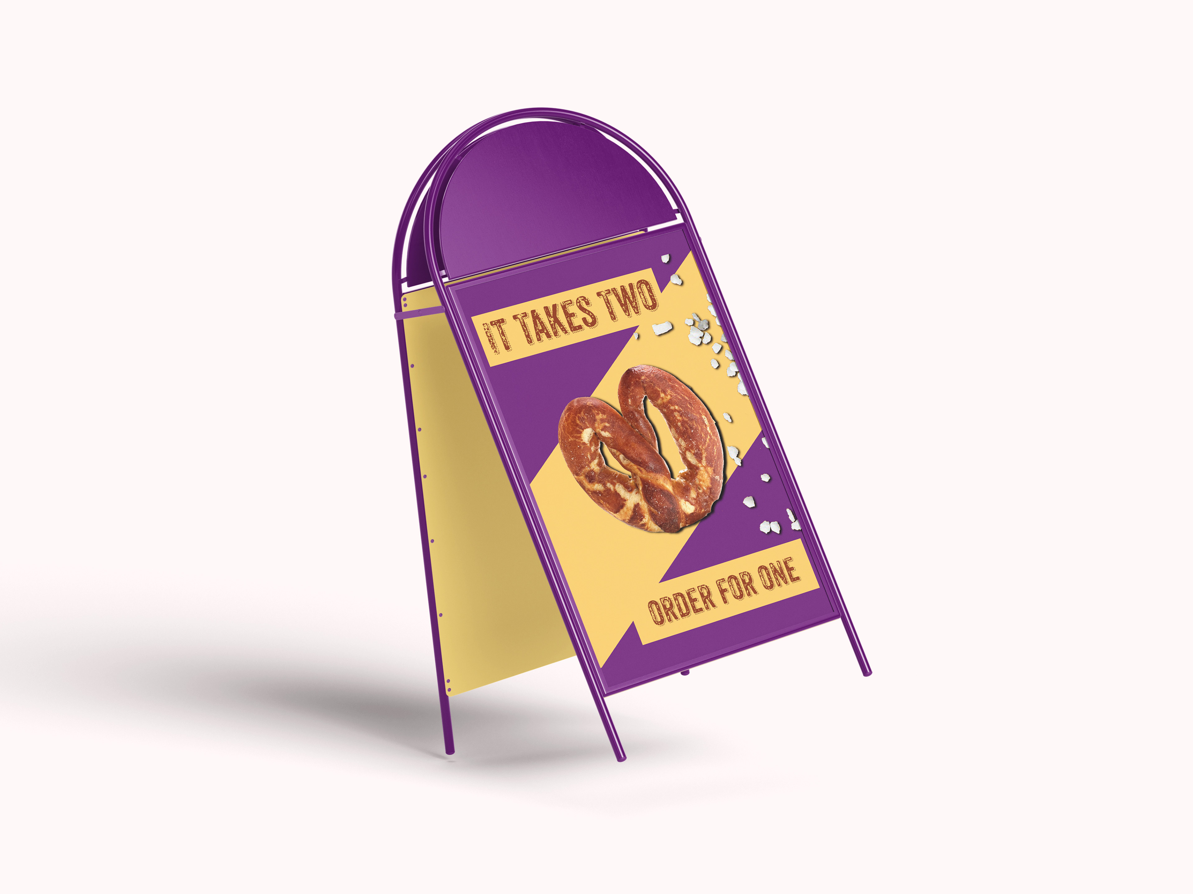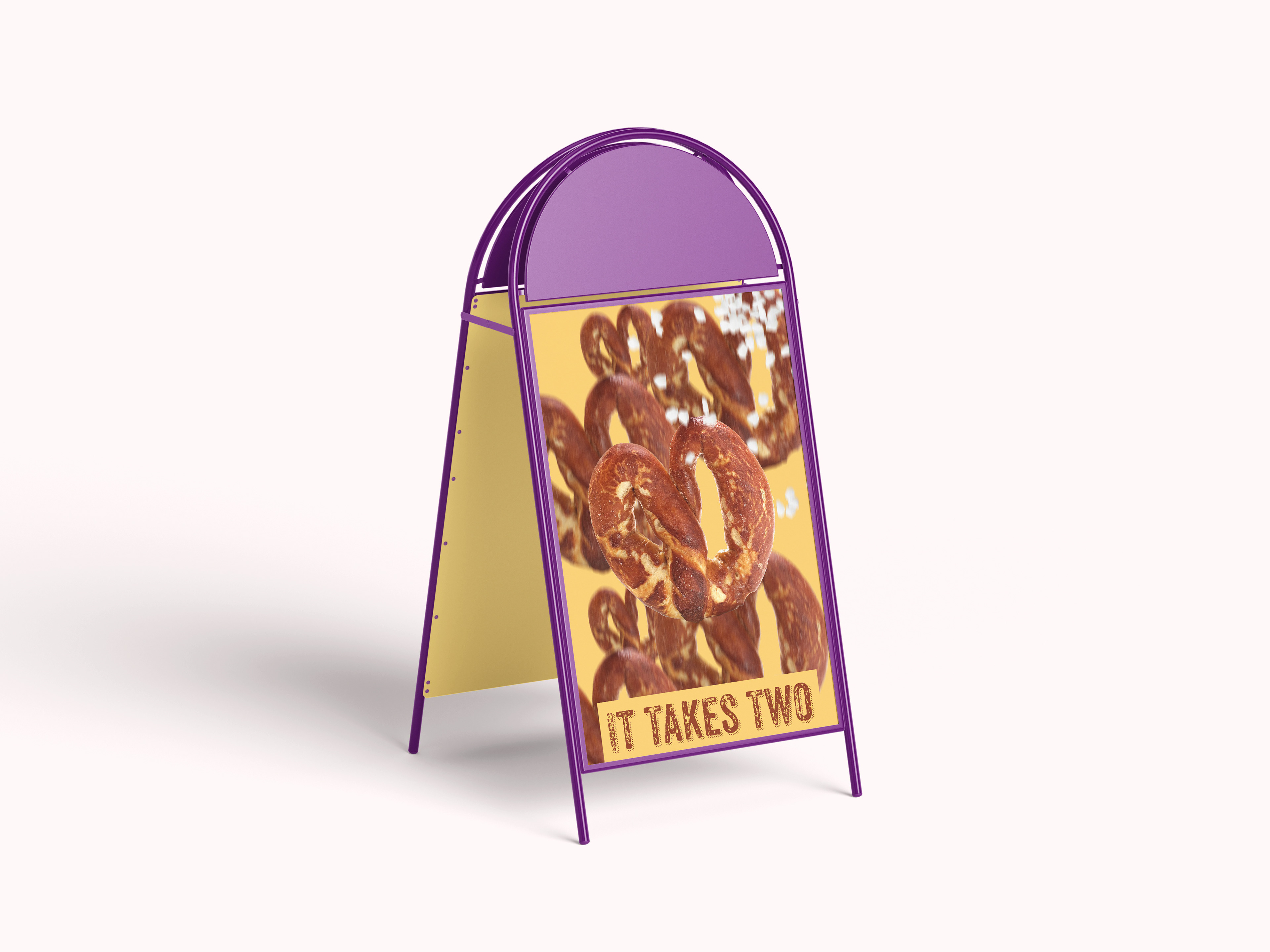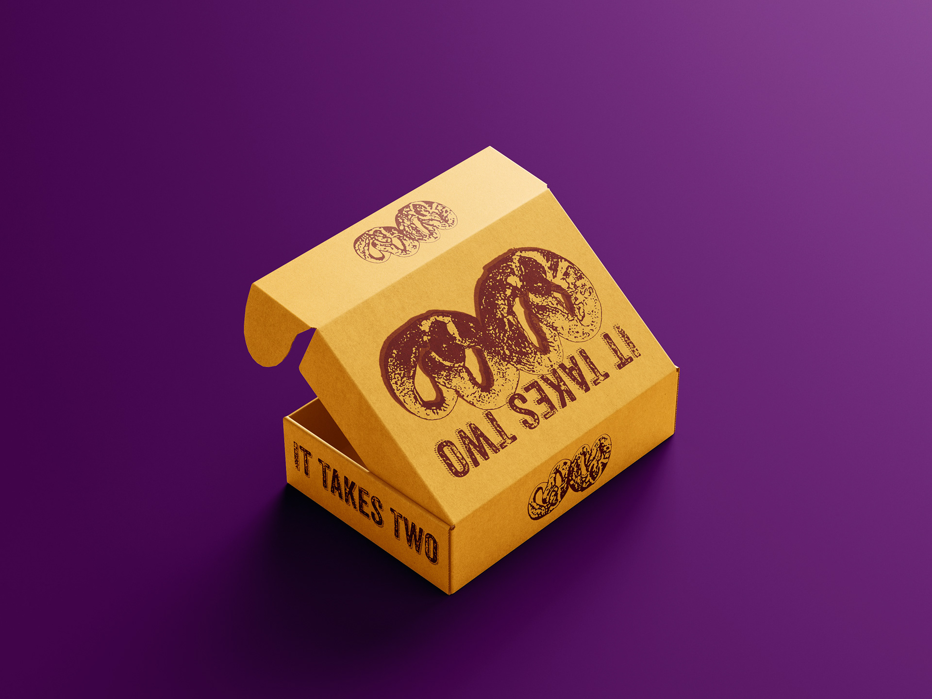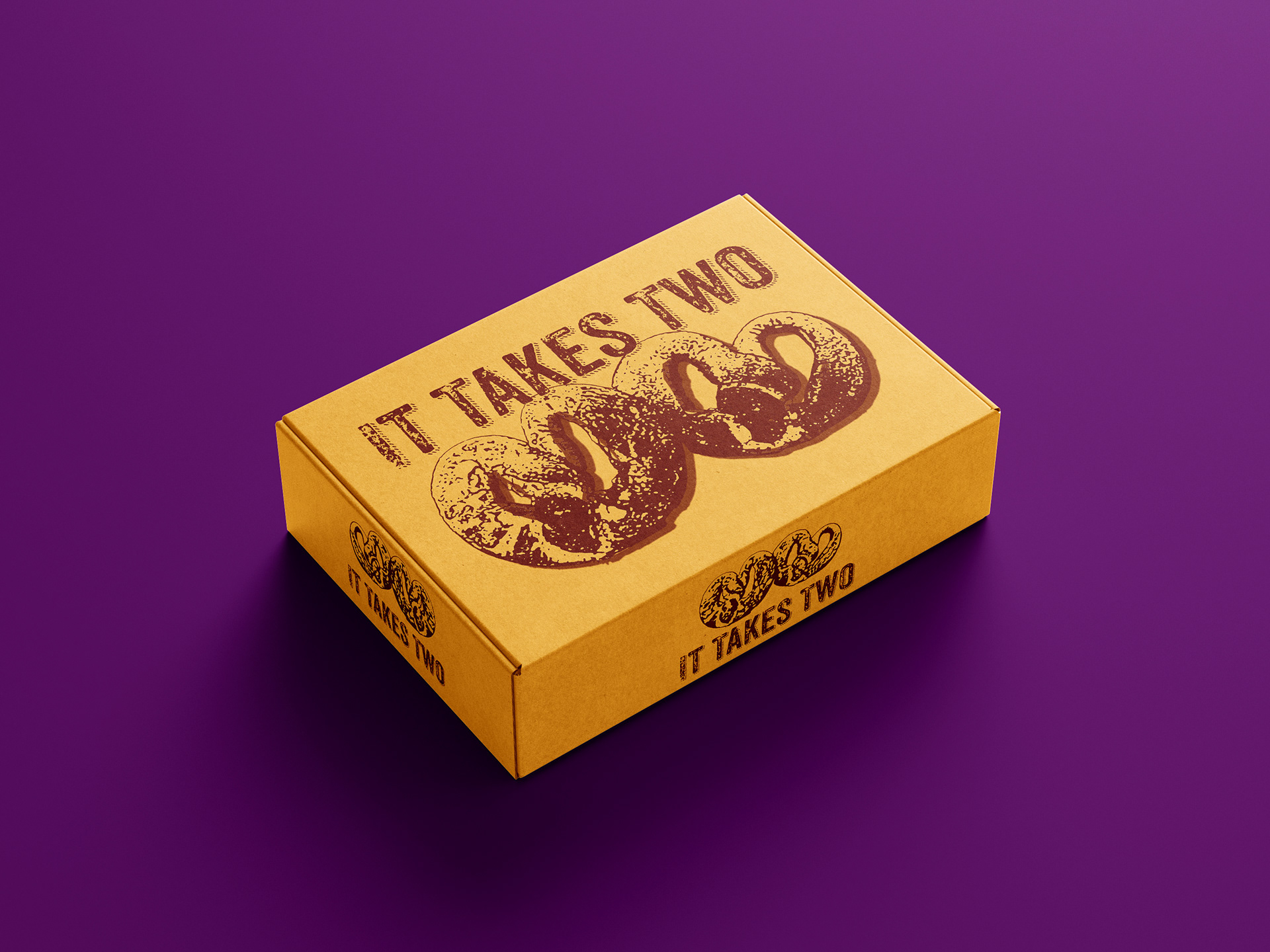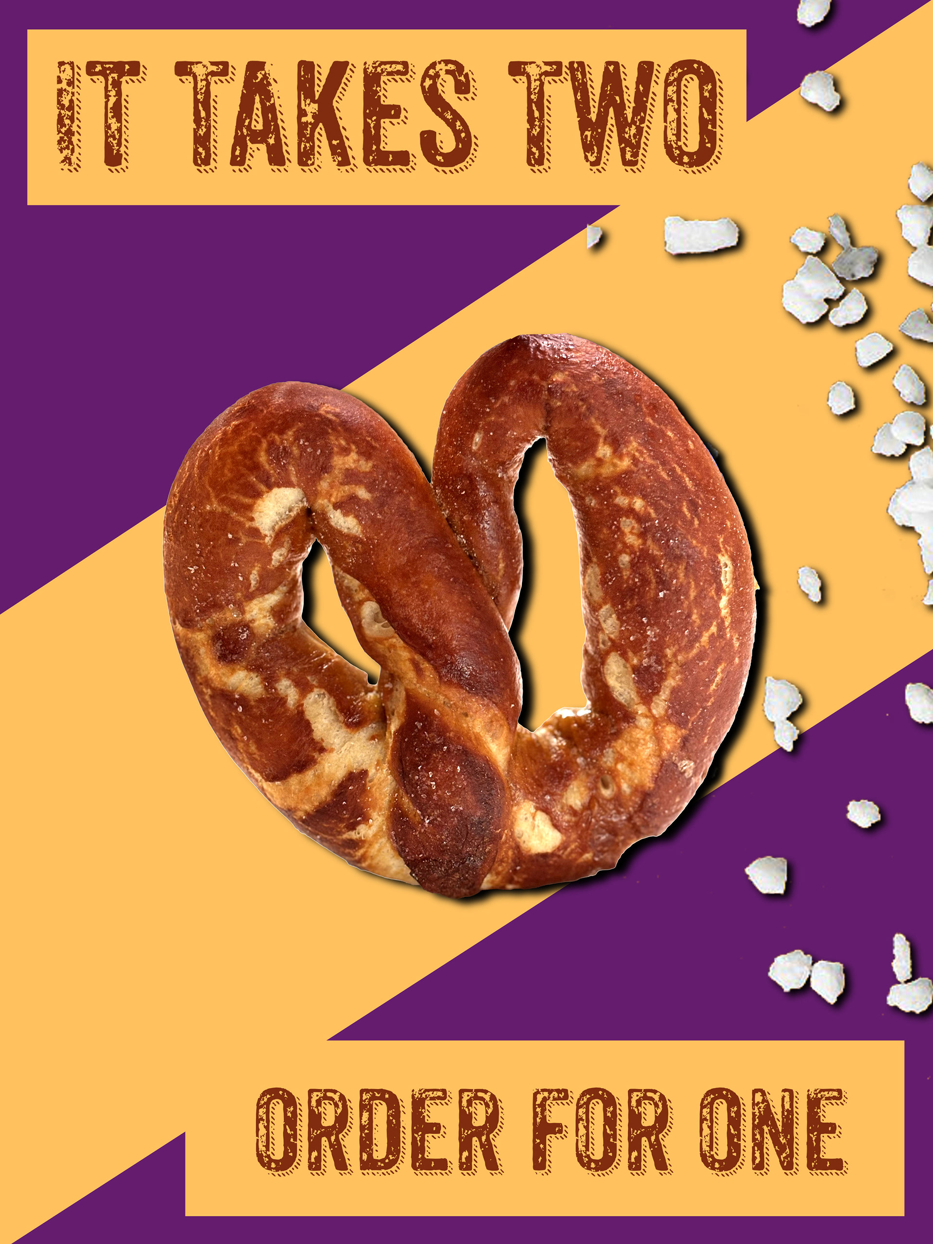 The purpose of this project was to repurpose some images of soft pretzels I've made into some kind packaging and advertising. "It Takes Two," is a mom and pop shop started by a married couple 20+ years ago in the pretzel capital of the US, Philadelphia.