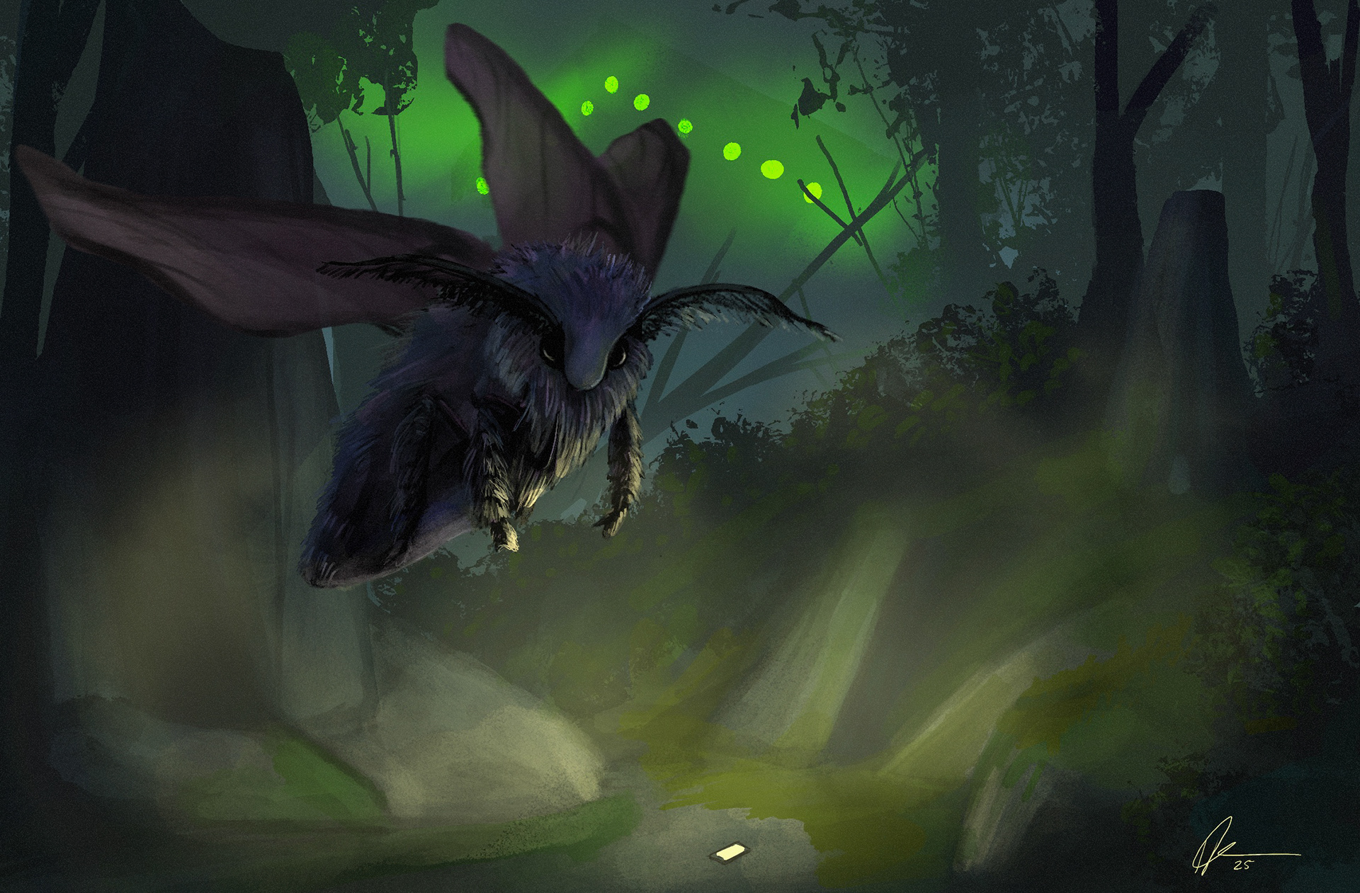 A gigantified moth drawn to the light of what appears to be a dropped phone?